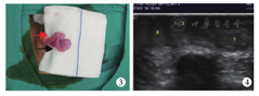 例2 男,1岁2个月,因右侧阴囊空虚、左侧阴囊内肿物入院,诊断为"右侧异位睾丸"。体格检查时患儿右侧阴囊空虚,于右侧阴囊及腹股沟区均未触及睾丸,左侧阴囊发育可,阴囊内下方可触及睾丸,大小约10 mm×8 mm×7 mm,睾丸上方可触及两个类睾丸样肿物,最上方大小约8 mm×6 mm×6 mm,中部大小约6 mm×5 mm×4 mm;彩色超声检查示:右侧隐睾,左侧阴囊内睾丸上方睾丸样实性低回声(2个,考虑右侧睾丸横过异位合并多睾症),包膜光滑,形态规则,实质回声均匀;肿瘤标志物及性激素在正常范围内。术中见患儿左侧腹股沟区为2条精索血管及3枚睾丸样组织,右侧一条精索发育较差,较细,其末端可见一发育较差睾丸及附睾,睾丸大小约9 mm×7 mm×6 mm,左侧一条精索发育尚可,其末端可见两枚睾丸组织(图3),结合紧密,共享附睾及输精管,较大者约10 mm×7 mm×6 mm,较小者约6 mm×5 mm×4 mm,右侧精索血管及睾丸经阴囊中隔隧道固定于右侧阴囊内,左侧精索血管及睾丸固定于左侧阴囊内。患儿术后顺利出院。术后3个月及1、2、3年复查彩色超声均提示多睾症,双侧睾丸体积偏小(图4)。