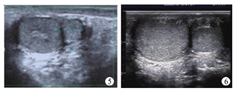 例3 男,4岁,因无意间发现右侧阴囊内肿物1月余就诊于我院门诊。查体见右侧阴囊内睾丸下方可及一类圆形肿物,大小约8 mm×7 mm×5 mm,边界清,质地较硬,活动度可,无触痛、按压痛。彩色超声检查示:双侧睾丸不等大,左侧大小约19 mm×16 mm×15 mm,右侧大小约14 mm×12 mm×11 mm,包膜光滑,回声均匀,右侧睾丸下方可见一大小约8 mm×6 mm×5 mm实性等回声,边界清晰,内回声均匀,与睾丸组织相类似(考虑多睾症)。实验室检查示甲胎蛋白及绒毛膜促性腺激素均在正常参考值范围内。采取保守治疗,定期复查。患儿采取保守治疗,每年复查一次彩色超声检查均提示多睾症(图5、图6),复查甲胎蛋白、绒毛膜促性腺激素均在正常参考值范围,随访5年至今,未见明显不适。