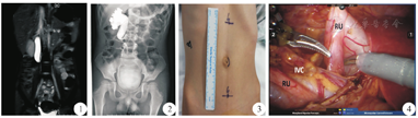 患儿 男,7岁。因"腹痛检查发现右肾积水1个月"入院。孕期产检未发现胎儿肾积水,患儿既往曾因法洛四联症行手术治疗。专科查体无明显异常。当地医院B型超声检查示右肾积水,考虑右侧输尿管上段狭窄可能;肾动态肾图检查示右肾肾小球滤过率(glomerular filtration rate,GFR)为44.28 ml/min,左肾GRF为46.25 ml/min,右肾GFR未见明显异常,但未见明显排泄。入我院后行磁共振泌尿系统水成像(magnetic resonance urography,MRU)检查,提示右肾中度积水,右侧输尿管上段扩张,中段狭窄且行走迂曲(图1)。行膀胱镜下逆行造影检查示右肾及右输尿管上段扩张积液,右输尿管中上段(约平L2-3椎体水平)走行迂曲(图2)。考虑诊断腔静脉后输尿管,行机器人辅助腹腔镜下右侧输尿管成形术。全身麻醉后导尿,取45°健侧卧位,垫高腰部。于脐左缘处取12 mm切口,置入腹腔镜套管。于前正中线脐上6 cm及脐下6 cm各取一8 mm切口(图3),镜头直视下置入操作套管,安装操作臂。术中沿结肠旁沟打开侧腹膜,于右肾下极暴露输尿管,见输尿管上段及肾盂扩张明显,输尿管中段走行于下腔静脉后侧(图4)。于腔静脉水平离断输尿管,使离断后的输尿管复位于下腔静脉前方,将切口下角向远端输尿管外侧壁纵行延长,至切开正常输尿管壁1~1.5 cm处(距离断点3.5 cm处可见输尿管相对狭窄),修剪近端输尿管切口边缘呈楔形。间断吻合输尿管。术中留置6F双J管1根。患儿手术顺利,手术时间3 h,输尿管游离、离断、吻合时间为80 min。术中出血约30 ml。术后病理检查结果示黏膜被覆尿路上皮灶性脱落,黏膜下水肿伴充血出血,各层少许炎症细胞散在浸润,血管充血。患儿恢复良好,无不适主诉,术后5 d拔除导尿管后出院。术后6周拔出双J管,复查彩色多普勒超声提示右肾积水较前明显缓解。术后半年随访患儿腹痛症状较前改善,偶有轻微发作。本次研究患儿家属均知情同意。