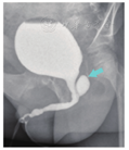 5例患儿年龄为(47.2±42.2)个月,范围在1岁至9岁4个月,中位数为36个月。附睾炎和尿路感染发作3~6次,平均3.8次,中位数4次,附睾炎均为单侧发作。行泌尿系统彩色超声和排尿性膀胱尿道造影检查显示后尿道可见前列腺小囊(图1);患儿尿道下裂术后排尿通畅,最大尿流率(Qmax)为(6.3±1.8)ml/s,中位数为5.6 ml/s。本研究已通过医院伦理委员会审核[伦审(研)2020年第99号],并获得所有参与研究患儿家属的知情同意。