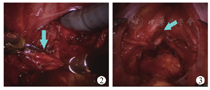 打开盆底腹膜,沿双侧输精管寻找前列腺小囊。由前列腺小囊的顶端向盆底方向游离前列腺小囊,避免损伤直肠和输尿管(图2)。游离前列腺小囊至尿道。于前列腺小囊前壁远端纵向切开囊壁,明确前列腺小囊汇入尿道的位置,避免尿道损伤。于双侧输精管汇入前列腺小囊顶端的水平切断前列腺小囊。于靠近尿道处切断前列腺小囊颈部。移除中间段的前列腺小囊组织,用6-0 Vicryl将连着双侧输精管的前列腺小囊壁与尿道端的前列小囊残壁进行吻合(图3)。在盆底放置一根引流导管。