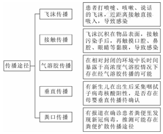 COVID -19的病原体是2019新型冠状病毒(2019 -nCoV),2019 -nCoV是β新型冠状病毒属,为有包膜的单股正链RNA病毒。现有研究显示,该病毒存在经呼吸道飞沫和密切接触传播两种主要传播途径,是否存在气溶胶传播、垂直传播等尚无定论[5](图1)。