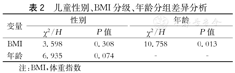 性别与BMI分级、年龄组间相关性差异无统计学意义,年龄分组与BMI分级间相关性差异有统计学意义(P=0.013,表2)。多重比较发现,3岁组与4岁组间BMI总体分布位置不同(α'=0.004)。