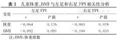采用Spearman相关性分析发现,体重与LFPI、RFPI间的相关关系无统计学意义(P=0.176和0.078),而BMI和RFPI之间具有负相关关系(P=0.033,表3)。