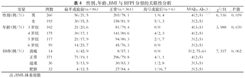 | 变量 | 例数 | 扁平或旋前(n=86) | 正常(n=361) | 高弓或旋后(n=6) | M(Q25,Q75) | χ2/H | P值 | |