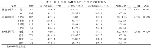 采用SPSS 25.0进行统计学分析,连续性非正态分布计量资料用中位数和四分位间距[M(Q25,Q75)]表示,分类资料用(例数/百分比)表示。性别、年龄、BMI与LFPI、RFPI分型间差异比较采用卡方检验或Fisher确切概率法、Kruskal-Wallis H检验、多组独立样本的秩和检验及多重比较进行分析。Spearman相关分析分析体重、BMI与LFPI、RFPI的相关性。以P<0.05为差异有统计学意义。