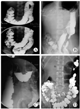 肠系造影检查为主要诊断方法,指征包括:横结肠冗长悬吊、甚至坠入盆腔,造影剂形成液平面;脾曲高悬,横结肠与降结肠间形成锐角,造影剂经过受阻;乙状结肠冗长,扭曲扩张,直肠无狭窄,可见粪便堆积;24 h复查造影剂排空障碍,残留于横结肠、乙状结肠及直肠(图1)。