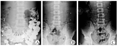 所有患儿行肠系造影及排空检查,均可发现横结肠冗长悬垂坠入盆腔,脾曲高悬,横结肠与降结肠之间形成锐角,以及乙状结肠冗长扭曲、排空延迟的典型征象(图2)。