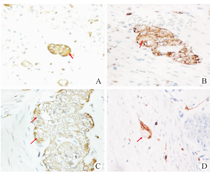术后病理学检查诊断为肠神经元发育不良症(intestinal neuronal dysplasia,IND)14例;节细胞减少症11例。肠神经系统病理变化见表2。肠神经丛及神经节细胞病变通过免疫组化染色可见神经丛中节细胞减少、节细胞变性、神经丛中神经纤维增生及黏膜下出现孤立神经元等(图3)。