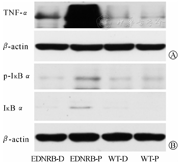 由于HSCR的扩张肠段黏膜屏障受损,致使病原微生物趁机进入固有层,激活定居的巨噬细胞产生适应性免疫反应,并募集血液中的单核细胞释放大量炎症因子,导致组织的损伤。在炎症反应中,巨噬细胞起着重要的作用,肠道脂多糖通过与巨噬细胞Toll样受体4(TLR4)结合引发巨噬细胞活化,从而活化丝裂原活化蛋白激酶(MAPK)信号通路和NF-κB,导致细胞因子白细胞介素-6(IL-6)、TNF-α等产生[7]。NF-κB是众多细胞因子和炎症介质表达的主要转录因子,在许多炎症因子及生长因子的表达调节中起着关键作用。IκBα的磷酸化是NF-κB活化的重要标志,也是日前发现的NF-κB活化的最重要途径。Ednrb-/-小鼠模型是研究HSCR肠炎发病机制非常好的模型,表现为远端结肠细小,近端扩张明显,小鼠在21日龄时尤为明显,且体重较野生型轻[8](图1)。在我们前期研究的基础上,本研究中我们进一步发现扩张段结肠组织TNF-α、p-IκBα、IκBα蛋白及IκBα mRNA的表达水平较狭窄段升高,从胞内机制方面提示实验组小鼠结肠组织炎症主要发生在扩张段。