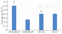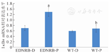 注:EDNRB-D,实验组小鼠狭窄段结肠组织;EDNRB-P,实验组小鼠扩张段结肠组织;WT-D,对照组小鼠远段结肠组织;WT-P,对照组小鼠近段结肠组织;a,EDNRB-D与EDNRB-P相比,P<0.05;b,WT-D与WT-P相比,P>0.05