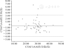采用SPSS19.0软件(SPSSInc.,Chicago,IL,USA)进行统计学分析。利用配对t检验验证CTAI、AAI、BAI之间差异的有效性;利用独立样本t检验进行各组AAI和BAI差值的比较;利用Spearman相关分析和Bland-Altman分析检验两种测量结果之间的一致性。所有数值变量均按Mean±SD表示;所有统计学数据基于P<0.05考虑差异具有统计学意义。