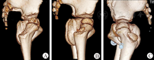 1936年,Kleinberg和Lieberman最早提出了髋臼指数概念作为髋关节脱位的影像学诊断指标[9]。目前,髋臼指数已广泛应用于婴幼儿髋关节发育的影像学评估[10],对于髋臼发育不良和髋脱位后残余髋臼发育不良的患儿,髋臼指数可以预测其是否需要接受骨盆截骨术,有助于临床医生对其治疗方案的选择和制定[11,12]。虽然已被广泛应用,但是其测量的准确性仍然受多种因素的影响,骨盆的摆放体位[13,14],髋臼外上缘骨性部位的选择,H线选择不同等均是髋臼指数测量差异的主要来源。临床上,不同医师基于同一张骨盆X线平片所测得的髋臼指数也可以存在很大差异。因此,选择正确的髋臼外上缘将会使所测的髋臼指数更加接近于"真实"值。通过骨盆三维CT数据进行骨盆模型重建,生成的DRR图像能够代替该骨盆空间位置下X线光照射所生成的骨盆平片,其有效性和准确度已经得到了广泛的认可[15]。前人的研究显示儿童髋臼指数的测量误差约在3°以内[13],而本研究中所有髋关节采用A点和B点测量的髋臼指数差值为(3.06±3.06)°,其中Ⅳ型髋臼的测量差值为(7.22±2.25)°,最大达到11.60°,远远超过了AI的测量误差。Kim等[16]也选取不同的髋臼外上缘点进行髋臼指数同样也发现此差异,但其研究并未验证两种方法测量值与真实值的差异。Agus等[17]采取上述两点测量中心边缘角探究其合理测量方法,发现其两种测量方法的差异在3.6°左右。我们的研究,排除了骨盆异常体位所带来的误差,在标准的骨盆空间位置上,可以同时获取类骨盆平片的DRR图像和准确反映骨性髋臼外上缘的冠状位CT图像,该方法不但能够观察两种测量方法的差异,并且为不同的髋臼指数与"真实"髋臼指数的直接对比提供了条件。本研究中,按照Ogata等[7]的髋臼形态分型方法,我们看到Ⅰ/Ⅱ型髋关节因其A点与B点重合,故该类髋关节其AAI与BAI差值为零;Ⅲ型髋关节其差值为(3.77±1.78)°,而Ⅳ型髋关节差异值则达到(7.22±2.25)°,其三者差异具有统计学意义。此外,正常髋关节的AAI与BAI差值较发育不良髋关节的差值较小,然而其差异并没有统计学意义。可见,骨盆X线平片上髋臼外上缘的形态改变是决定AAI与BAI差异大小的关键,这意味着,对于Ⅳ型髋关节而言,髋臼外上缘测量参照点的错误选择将对AI测量产生巨大的影响。临床上,髋臼指数反映的是髋臼顶部对股骨头的骨性覆盖。本研究中,我们选取通过该侧股骨头最大直径的骨盆冠状位MPR片,此时的骨性髋臼代表髋关节中心平面的髋臼顶,该平面上测量CTAI所采用的外上缘点即为真实的髋臼骨性外上缘点,因此,我们认为其能代表"真实"的髋臼指数。根据本研究结果,CTAI与AAI之间具有极高的相关性并且两者之间差异并不明显,Bland-Altman分析显示其两者具有高度的一致性。根据统计学原理,AAI与CTAI的测量结果在一定程度下可以互换,A点在骨盆平片上相对于B点能够更加准确的反映真实的髋臼外上缘点。然而,本研究结果中,仍然存在3例髋关节其CTAI与AAI的差异过大。对该3例髋关节进行骨性三维重建,我们发现该3例病例的髋臼病理改变均为局部的髋臼中上缘缺损型(图6)。本研究测量的CTAI在髋关节中心冠状位平面上进行测量,当MRP平面通过髋臼中上缘骨性缺损时,在CT图像上测量髋臼指数时其外上缘的终点将会向内侧移动,该情况导致CTAI的值增大,而此时在骨盆平片上,髋臼上缘其余部分未出现缺损,因此A点并未产生移动,此时AAI的测量值所反映的仍然是真实的骨性髋臼覆盖。髋臼缘局部的病理变化导致CTAI与AAI的差异增大,其散点分布在两者平均差异的95%可信区间之外,影响了整个研究数据的一致性。
