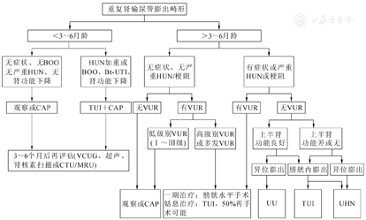 共识3 出生后进行影像学评价,3~6月龄以下者多保守治疗。根据病情需要及家长意愿选择CAP治疗,但CAP适应证及用药时间等无明确标准,远期风险不确定。fUTI者需行抗感染治疗,对于UTI控制不佳、脓毒症状重并有明确输尿管梗阻者,需行输尿管减压手术利于控制感染。