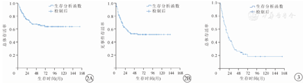 总复发进展69例中,3年内复发进展66例,5年内复发进展69例,3年和5年EFS分别为(55.1±4.2)%和(53.2±4.3)%(图2B)。