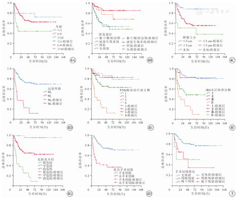 Kaplan-Meier单因素分析显示与患儿的存活率相关的独立因素有:患儿年龄(χ2=3.318,P=0.010)、肿瘤部位(χ2=11.146,P=0.001)、肿瘤大小(χ2=16.688,P<0.001)、远处转移情况(χ2=36.792,P<0.001)、治疗前的临床分期(χ2=38.188,P<0.001)、是否手术切除(χ2=29.418,P<0.001)、IRS术后分期(χ2=55.042,P<0.001)和危险度分组(χ2=47.900,P<0.001)。Kaplan-Meier生存曲线如图4。