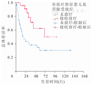 入组患儿中88例存在放疗指征,其中25例实际接受放疗;另有11例超指征接受放疗。在有放疗指征患儿中,生存分析发现接受放疗患儿总体存活率高于未接受放疗患儿(χ2=8.616,P=0.003),Kaplan-Meier生存曲线如图6。在无放疗指征患儿中,是否接受放疗并不影响患儿存活率(χ2=0.063,P=0.802)。
