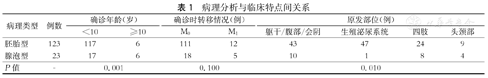 | 病理类型 | 例数 | 确诊年龄(岁) | 确诊时转移情况(例) | 原发部位(例) | |||||