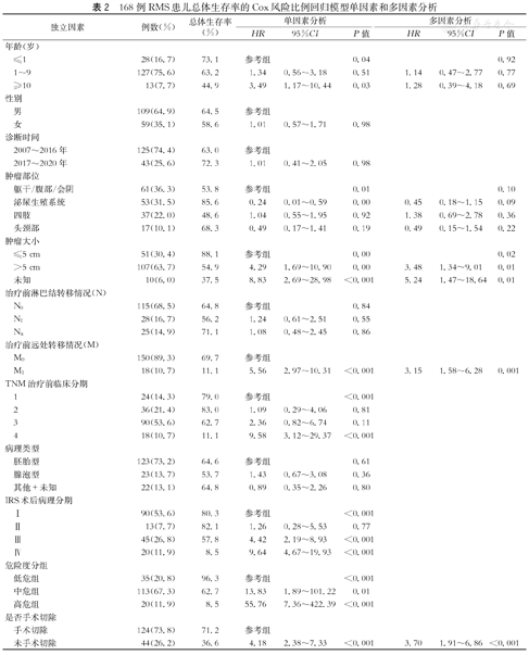 168例RMS患儿总体生存率的Cox风险比例回归模型单因素和多因素分析