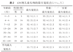 | 年龄段(月) | 性别(例) | 最大宽度点 | 男童最大宽度点 | 女童最大宽度点 | |