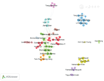 共有7 446位作者(包括第一作者及通讯作者)参与HSCR相关研究,其中文献发表量最多的是都柏林妇女儿童医院的Puri Prem,占3.47%(62/1 786),其次是南京医科大学的唐维兵,占2.24% (40/1 786),都柏林妇女儿童医院的O'Donnell Anne Marie,占1.85% (33/1 786),香港大学的谭广亨和卡洛林斯卡学院的Wester Tomas并列第四,占1.79%(32/1 786)。通过VOSviewer软件构建可视化图谱,分析不同作者的文献发表量和合作关系,结果显示37位作者的文献发表量≥10篇,作者的文献发表量用节点的面积大小表示,节点越大表明作者的文献发表量越高(图3)。颜色相同的作者表示合作关系密切,并形成聚类,线条的粗细程度表示合作关系的强度。