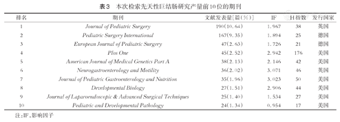 WoSCC数据库中检索出1 786篇HSCR相关文献,分别发表在568种期刊上,平均每种期刊发表3.14篇,其中文献发表量最大的期刊是美国的Journal of Pediatric Surgery刊载190篇。本组列举文献发表量居于前10位的期刊(表3),分别来自美国、德国、英国的期刊。前10位的期刊中影响因子最高的杂志是英国的Neurogastroenterology and Motility (IF=3.071),在HSCR领域文献刊出量共36篇,位于第6位。英国期刊的文献刊出量(226篇)最多,其次分别是德国(214篇)和美国(194篇),三个国家期刊的文献刊出量在总体差距不大。