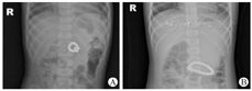 随着生活水平的提高,现在儿童接触到的玩具种类越来越丰富,由于儿童缺乏分辨能力,习惯将小物品放入口中造成误食。误食异物在幼儿期及学龄前期儿童中较常见,临床中80%~90%的消化道异物无明显症状,大部分能自行排出体外,少部分表现为腹痛、呕吐、发热等肠梗阻及腹膜炎症状,需要治疗干预,其中误食多枚磁铁异物较为常见[6]。Bousvaros等[7]报道近10年来美国儿童误食磁铁异物的病例是过去所有病例总和的2倍。Talvard等[8]总结法国40例误食磁铁异物的病例,发现其中60%(24/40)为误食多枚磁铁异物。