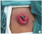6例经内窥镜(腹腔镜、胃十二指肠镜、结肠镜)辅助下取出异物,2例经传统开腹手术取出异物,1例保守治疗后自行排出异物,异物数目范围为4~25枚;3例术中发现多处肠管穿孔,最少2处,最多5处,1例发现胃穿孔,2例术中发现肠内瘘形成,经积极治疗后均顺利恢复,无并发症发生。9例患儿随访至今均无并发症发生。图2显示经腹腔镜辅助经脐部扩大切口拖出肠管取出异物。
