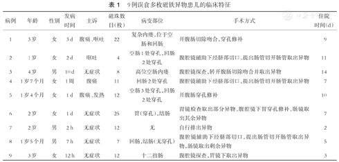 儿童辨别食物的能力尚未成熟,临床中儿童误食异物的情况较为常见,如误服珠子、硬币、纽扣电池等,通常只要异物大小适中,边缘规则,大多无明显症状可自行排出,但如果误食的是有磁性的异物很容易产生并发症[1,2,3,4,5]。单枚磁铁异物多可自行排出,而多枚磁铁异物则可能产生严重并发症,尤其是分次吞服多枚磁铁异物时,胃肠道不同部位的磁铁异物相互吸引,导致食管或胃肠道管壁或系膜受压坏死、穿孔,形成多发肠穿孔、腹膜炎、腹内疝、肠梗阻甚至内瘘形成,严重的引起休克、死亡[6]。本研究报道福建省妇幼保健院收治的9例儿童误食多枚磁铁异物病例,进行经验总结。