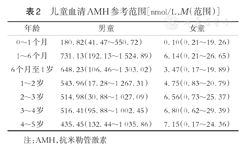 国内王斐等[16]通过ELISA法-双抗体夹心法,多中心大样本检测了国内1 400例0~5岁健康儿童血清AMH浓度,得出儿童血清AMH浓度范围(表2)。