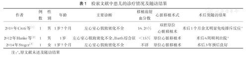 截至2021年1月,共检索到婴幼儿NVM心脏移植术相关文献3篇,均为英文病例报道。其中,2010年,Croti等[1]为1岁7个月的男性LVNC患儿进行了原位心脏移植术,该患儿3月龄时即表现出呼吸费力、支气管痉挛及体重不增。1岁时因支气管痉挛及严重呼吸困难入住CICU,存在肝肿大,出现失代偿性充血性心力衰竭的症状,住院期间确诊LVNC并发现左心室血栓,给予抗心衰及抗凝治疗,期间患儿突发1次心搏骤停;供心来源为1岁3个月的女童,移植手术成功,术后1个月余未发生明显的免疫排斥反应[1]。2012年,美国辛辛那提儿童医院Hanke等[2]对1例诊断为Barth综合征合并LVNC的1岁患儿进行了心脏移植术,该患儿出生后3 d便出现心源性休克合并多器官功能衰竭,随后被诊断出LVNC,进一步行遗传检测明确诊断为Barth综合征,长期的药物治疗逐渐失效,日益恶化的心力衰竭和难治性室性心动过速促使患儿接受双心室辅助装置植入,在植入24 d后接受心脏移植,术后6周顺利出院。2014年,Steger [3]报道了对1例1岁7个月的女性LVNC患儿进行原位心脏移植术,该患儿因出现呼吸困难、心动过速和体重减轻的症状入院,被进一步检查诊断为LVNC,由于心力衰竭的快速进展和反复出现的心脏失代偿,接受药物治疗的同时,该患儿被列入高度紧急的移植名单,4个月后患儿接受了心脏移植,术后随访3年,患儿身体状况良好,生长发育情况如同龄正常儿童。上述检索患儿的诊疗情况及随访结果详见表1。