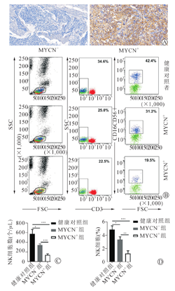 本组所收集的30例NB患儿中,经免疫组织化学染色,有19例患儿MYCN呈现高表达状况,11例患儿MYCN呈现低表达状况,免疫组织化学染色结果见图1A。NB患儿中NK细胞数量及比例为(240. 83±116. 78)%比(2. 32±1. 21)%,均显著低于健康对照组(579. 00±54. 81)%比(4. 86± 0. 57)%,其中MYCN阳性患儿降低更明显,为(136. 33±26. 08)%比(1. 27±0. 42)%,三组间差异具有统计学意义(F = 45. 53, P = 0. 0002比F= 43. 93, P = 0. 0003),见图1B、图1C、图1D。