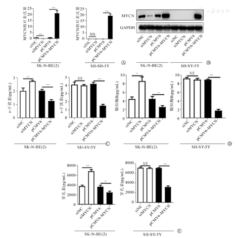 为检测MYCN对NK细胞分泌细胞因子的影响,本组对两种NB细胞系进行MYCN干扰/过表达,MYCN干扰/过表达效果验证见图2A、图2B。同时将两种细胞系分别与正常NK细胞进行共培养,检测培养上清中三种细胞因子(γ-干扰素、颗粒酶B和穿孔素)的分泌状况,可以看出MYCN过表达时,NK细胞分泌的三种细胞因子显著降低[SK-N-BE(2):2. 03±0. 10比1. 27±0. 11,t =9. 10, P= 0. 0008; 4. 41±0. 59比2. 51±0. 36, t =4. 76, P= 0. 0089; 3614. 70±335. 37比2424. 25±289. 37,t =4. 66,P= 0. 0096;SH-SY-5Y: 4. 21± 0. 22比1. 50±0. 18, t= 16. 79, P<0. 0001; 8. 50±0. 18比1. 64±0. 28, t= 35. 85, P<0. 0001; 7038. 43±138. 41比3144. 23± 235. 89, t=24. 66, P<0. 0001],而当干扰MYCN表达时,NK细胞分泌的三种细胞因子显著增加[SK-N-BE(2): 2. 02±0. 22比2. 75±0. 07, t=5. 49, P= 0. 0054; 4. 38±0. 49比8. 53±0. 96, t=6. 67, P= 0. 0026; 3714. 62±228. 00比6797. 94±370. 42, t =12. 28, P=0. 0003; SH-SY-5Y:4. 11±0. 34比4. 00± 0. 14, t =0. 52, P = 0. 6282; 8. 80±0. 23比8. 52± 0. 30, t=1. 25, P=0. 2781; 7078. 00± 210. 32比7012. 81±168. 19, t =0. 42, P=0. 6966](图2C、图2D、图2E)。
