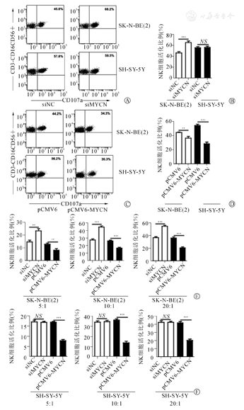 表达肿瘤特异性的嵌合抗原受体的T细胞(T cells expressing tumor-specific chimeric antigen receptors,CAR-T)对B细胞或非B细胞来源的恶性肿瘤均具有较好疗效,但是CAR-T的临床应用受到了其副作用的限制[5]。自然杀伤细胞(natural killer cells,NK cells)为固有免疫系统的重要组成部分,它可通过释放颗粒酶、穿孔素等细胞毒性因子发挥免疫监视、清除肿瘤细胞等作用[6]。因此,基于NK细胞的肿瘤免疫治疗成为又一令人期待的免疫疗法,然而在肝癌、肺癌、白血病等模型的研究中发现NK细胞在肿瘤微环境中受到抑制[7,8]。目前,NB患儿体内NK细胞数量及功能的变化尚不清楚。因此,本研究拟通过体内外试验探究NB中MYCN表达对NK细胞活化、功能的影响,并初步探究其潜在的分子机制,以期为改善NB患儿肿瘤微环境,恢复NK细胞抗肿瘤功能及改善NB患儿预后提供重要理论依据。