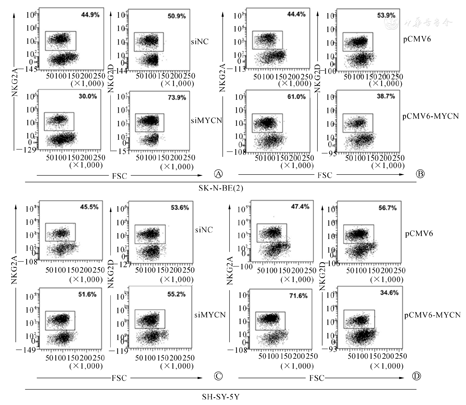 为进一步探究MYCN高表达抑制NK细胞杀伤功能的原因,本组使用流式细胞术检测了共培养体系中NK细胞表面主要抑制性受体(NKG2A)和活化性受体(NKG2D)表达状况。结果显示,与siNC组相比,siMYCN组NK细胞NKG2A表达显著降低(44. 37±1. 67比32. 03±1. 82, t=8. 67, P= 0. 0010;),NKG2D表达明显升高(50. 57±1. 72比71. 03±2. 76, t=10. 90,P=0. 0004)(图4A),在SH-SY-5Y细胞中干扰MYCN对NK细胞表面NKG2A (46. 53±1. 17比48. 93±2. 56, t=1. 48, P=0. 2143)和NKG2D(52. 57±1. 00比54. 13±1. 22, t=1. 72, P = 0. 1611)表达差异无统计学意义(图4C)。与pCMV6组相比,pCMV6-MYCN组NK细胞NKG2A表达显著增加[SK-N-BE(2): 43. 33±1. 16比59. 97±2. 89, t=9. 25, P= 0. 0008; SH-SY-5Y: 48. 87±1. 45比70. 83±2. 15, t=14. 65, P= 0. 0001],NKG2D表达明显降低[SK-N-BE(2): 53. 37±2. 64比40. 07±1. 80, t=7. 21, P=0. 0020; SH-SY-5Y: 52. 97±3. 45比34. 17±1. 50, t= 8. 66, P = 0. 0010](图4B、图4D)。这说明MYCN高表达可能通过抑制NK细胞表面NKG2D受体,促进NKG2A的表达从而介导NB细胞对NK细胞的杀伤逃逸作用。