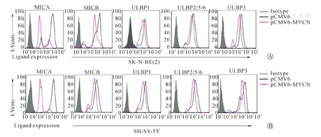 为进一步分析MYCN对NB细胞表面NKG2D配体的表达状况,我们使用们通过流式细胞术分别检测两种MYCN过表达NB细胞表面7种配体MICA、MICB、ULBP1、ULBP2/5/6和ULBP3的表达状况,结果显示与MYCN不表达的NB细胞相比,MYCN高表达的两种细胞系中7种配体荧光强度均降低,其中在SK-B-BE(2)细胞系中表现为MICA(32023. 33± 2470. 72比5078. 67±605. 42, t =18. 35, P<0. 0001)和MICB(12833. 33±416. 33比6329. 33± 282. 15, t = 22. 40, P < 0. 0001)配体荧光强度降低更明显(图5A),而SH-SY-5Y细胞系中主要表现为MICA(41233. 33±1159. 02比2377. 67±236. 32, t = 56. 90, P < 0. 0001)配体的荧光强度降低(图5B),这说明NK细胞对NB细胞的吞噬杀伤可能主要通过MICA和MICB两个配体发挥作用。