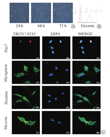 细胞贴壁48 h、96 h及分化培养基培养72 h,经固定与封闭后,以1∶50小鼠抗大鼠Pax7抗体及1∶100小鼠抗大鼠肌细胞生成蛋白(Myogenin)抗体、1∶100小鼠抗大鼠结蛋白(Desmin)抗体及1∶100兔抗大鼠肌球蛋白(Myosin)抗体,4℃孵育过夜。二抗为山羊抗小鼠IgG-TRITC、山羊抗小鼠IgG-FITC及山羊抗兔IgG-FITC,室温孵育1 h,DAPI标记细胞核。