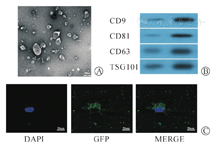 提取的外泌体在透射电子显微镜(transmission electron microscop,TEM)下观察为直径30~200 nm、大小不均的圆形或椭圆形囊泡,外形呈杯状,有膜结构包被,磷钨酸负染(图2A)。选取透射电镜下10个视野,计数直径在30~200 nm并且具有杯口形态的盘状囊泡占所有囊泡的占比,粗略计算出提取外泌体的纯度为72. 8%。Western blot检测外泌体特征性标志物CD9、CD63、CD81和TSG101蛋白富集(图2B)。绿色荧光蛋白(green fluorescent protein,GFP)标记的外泌体与BM-MSC共育后能被细胞摄取(图2C)。