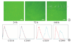 刚提取的BM-MSC呈圆形,大小较均一,胞膜清晰,胞体透亮,悬浮于培养液中;接种后24 h细胞贴壁生长,72 h细胞呈梭形,散在成簇分布,168 h后快速增殖,细胞排列紧密,细胞形态多样,以长的梭形细胞为主,呈旋涡状排列(图3A)。流式细胞鉴定BM-MSC表面标记物,细胞CD29、CD90呈阳性表达,阳性率分别为98. 7%与95. 6%,CD34、CD45表达呈阴性(图3B)。