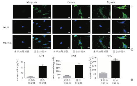 通过酶消化分离、差速贴壁提取的肌卫星细胞,Pax7表达阳性,增殖、分化后Myogenin、Desmin及Myosin表达阳性,Desmin流式细胞鉴定阳性率为94. 5%。超速离心法提取到圆形或椭圆形的成肌细胞外泌体,外形呈杯状,磷钨酸负染;WB检测CD9、CD63、CD81及TSG101表达阳性。GFP标记的外泌体可被骨髓间充质干细胞摄取。外泌体与骨髓间充质干细胞共同孵育,3 d后Myogenin表达阳性,6 d后Desmin与Myosin表达阳性。ELASA检测细胞上清胰岛素样生长因子Ⅰ(insulin like growth factor,IGFⅠ)、肝细胞生长因子(heptocyte growth factor,HGF)及成纤维生长因子(fibroblast growth factor2,FGF2)水平明显升高。