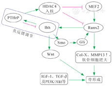 注:PTHrP,甲状旁腺激素相关蛋白;HDAC4,组蛋白去乙酰化酶4;Ihh,印度刺猬蛋白;MEF2,肌细胞增强因子;Runx2,runt相关转录因子2;MMP13,基质金属蛋白酶13;Col-X,X型胶厚;IGF-1,胰岛素样生长因子1;TGF-β,转录生长因子β;PI3K/Akt,磷脂酰肌醇三激酶/丝氨酸/苏氨酸激酶