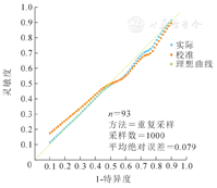 将两组中差异有统计学意义的指标进行多因素Logistic回归分析,结果极低GGT组中体重、性别、ALT、AST是诊断BA的独立危险因素(95%CI:0.777~0.926,P<0.001),低GGT组中性别、体重、是否早产、DB是诊断BA的独立危险因素(95%CI:0.870~0.985,P<0.001);根据相关数据绘制两组的列线图(图1、图2),区分度良好;绘制两组的ROC曲线(图3、图4),极低GGT组中女性、体重>3.4 kg、ALT>96 U/L、AST>107 U/L时BA可能性大,低GGT组中女性、足月、体重>4.2 kg、DB>101.5 μmol/L时BA可能性大。并得出两组预测模型的校准曲线(图5、图6),提示有较好的校准度。