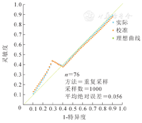 根据GGT分组为<150 U/L组(极低GGT组)和150~300 U/L组(低GGT组),记录患儿早产情况及术前最近一次肝功能各项指标的数值,分别比较极低GGT组、低GGT组中BA和非BA患儿一般资料及肝功能变化情况。运用R软件分析独立危险因素(R3.6.0),应用RMS程序包,建立列线图预测模型,利用受试工作特征曲线下面积(area under curve,AUC)判断模型的区分度,绘制校准曲线。
