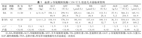血清γ-谷氨酰转肽酶<150 U/L组患儿术前临床资料