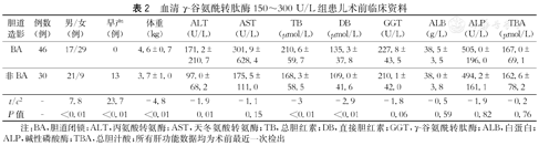 注:BA,胆道闭锁;ALT,丙氨酸转氨酶;AST,天冬氨酸转氨酶;TB,总胆红素;DB,直接胆红素;GGT,γ-谷氨酰转肽酶;ALB,白蛋白;ALP,碱性磷酸酶;TBA,总胆汁酸;所有肝功能数据均为术前最近一次检出