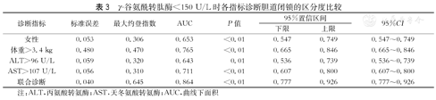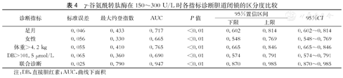 总之,GGT<300 U/L的胆汁淤积患儿中BA数量不在少数,且GGT<150 U/L和150~300 U/L时BA的诊断指标存在明显差异,对这部分胆汁淤积患儿应按GGT值采取不同指标预测其BA风险,早期考虑是否手术探查。