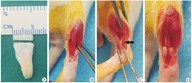 所有SD大鼠术前均禁食禁饮6 h,在2.0%异氟烷吸入麻醉下,使用10%聚维酮碘溶液消毒左侧胫骨,用手术刀在其左侧小腿前纵行切开胫骨前方皮肤和皮下筋膜,分离并牵拉开胫骨前肌,充分暴露胫骨。自胫腓骨连接处下方向胫骨远端(范围为0.2 cm)环形剥离骨膜,实验组取CPT患儿病变骨膜(长0.5 cm×宽0.2 cm×厚0.05 cm)包裹于骨膜剥离处,对照组取脑瘫患儿胫骨骨膜(长0.5 cm×宽0.2 cm×厚0.05 cm)包裹于骨膜剥离处,缝合肌肉固定骨膜,避免其发生移位,缝合皮肤,切口定期消毒。假手术组如上述方法暴露胫骨后,不做其他处理,依次缝合肌肉、筋膜和皮肤,切口定期消毒。(图1)