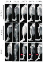 术后1 d小腿未见软组织肿胀,胫骨未见明显异常显影;术后1周未见软组织肿胀,胫骨移植区可见骨皮质周围高密度影形成;术后2~3周移植区胫骨纤细、髓腔狭窄,上下端类骨质生成(图2红色箭头所指部位);术后6周胫骨移植区胫骨纤细、髓腔狭窄情况仍存在,而上下端类骨质吸收硬化(图2)。