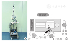 手术气动臂内镜支撑HAVE1系统(型号28172WSK),装置包含安装底座、空气压缩机和机器手臂三部分,共有5个气动关节、3个手动调节关节和1个微调关节,采用气动臂一键控制多关节实现精确定位,可满足手术全方位视野需求。以往气动臂使用时一般习惯将其安装在手术床的一侧导轨[5]。为了灵活使用气动臂,本团队通过定制专门的气动臂移动架(图1),可随时移动和固定气动臂装置,方便术者在不同术式中的调整。手术时将无菌保护套包裹气动臂,镜头固定于气动臂末端可开闭的夹锁,装置位于术者同侧(图2),由术者单人控制气动止锁开关,使镜头视野固定于任意进深和角度。