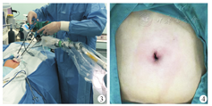 患儿术前常规禁食、禁饮,均采用全身麻醉下气管插管,取头低足高左倾仰卧位。在器械护士辅助下先于脐正中线做一长约2.5 cm切口直视下进腹,放置单孔腹腔镜穿刺器,建立气腹压力维持在8 mmHg~10 mmHg(1 mmHg=0.133 kPa),置入5 mm 30°腹腔镜,术者位于患儿左侧,并将镜头固定于气动臂夹锁关节(图3),经单孔操作平台置入操作器械。进行全腹腔探查,排除消化道畸形、肠道肿瘤等情况,沿结肠带找到阑尾,明确阑尾炎诊断。使用无创抓钳牵拉阑尾远端,展露阑尾系膜,分离钳钝性分类阑尾根部血管,1号丝线结扎根部血管系膜,使用电凝钩紧贴阑尾体从远端游离阑尾系膜至根部,圈套线套扎阑尾根部后剪断阑尾,残端电凝处理。局部冲洗腹腔,吸尽冲洗液,再次确认阑尾残端完整,无活动性出血,将阑尾标本连同镜头及单孔装置一起退出切口。碘伏消毒脐部切口,使用2-0可吸收线连续缝合关闭腹膜及肌肉筋膜组织,皮肤行皮内缝合,重建脐部外观(图4)。对照组常规单孔腹腔镜阑尾切除术需一助手协助扶镜,其余手术操作步骤基本相同。
